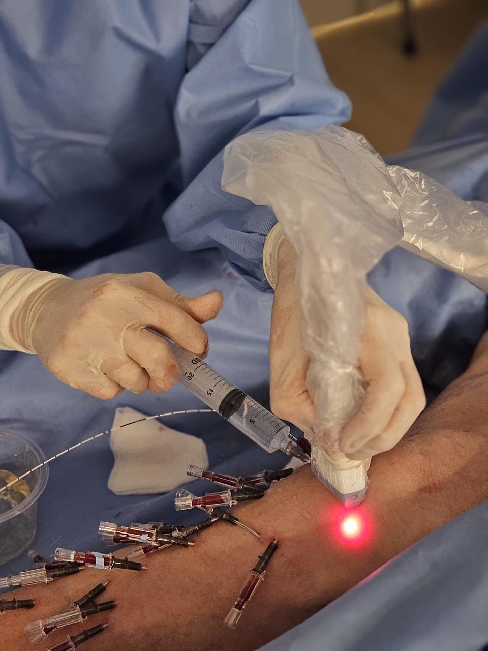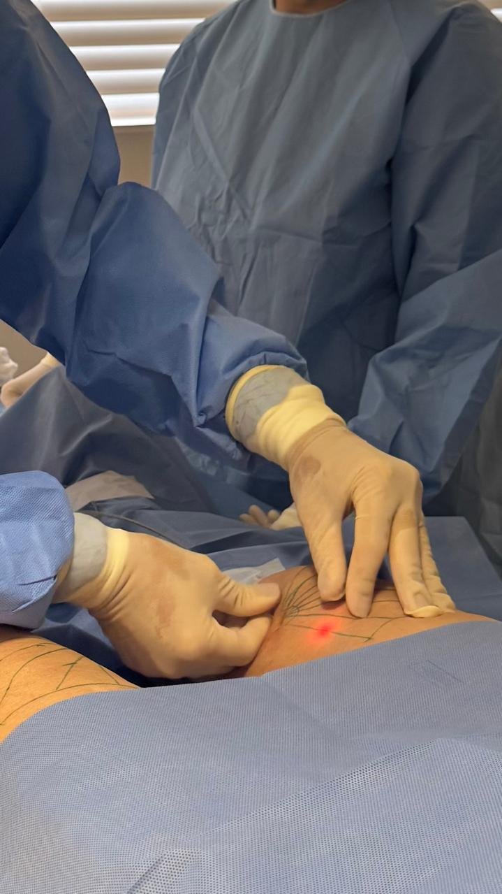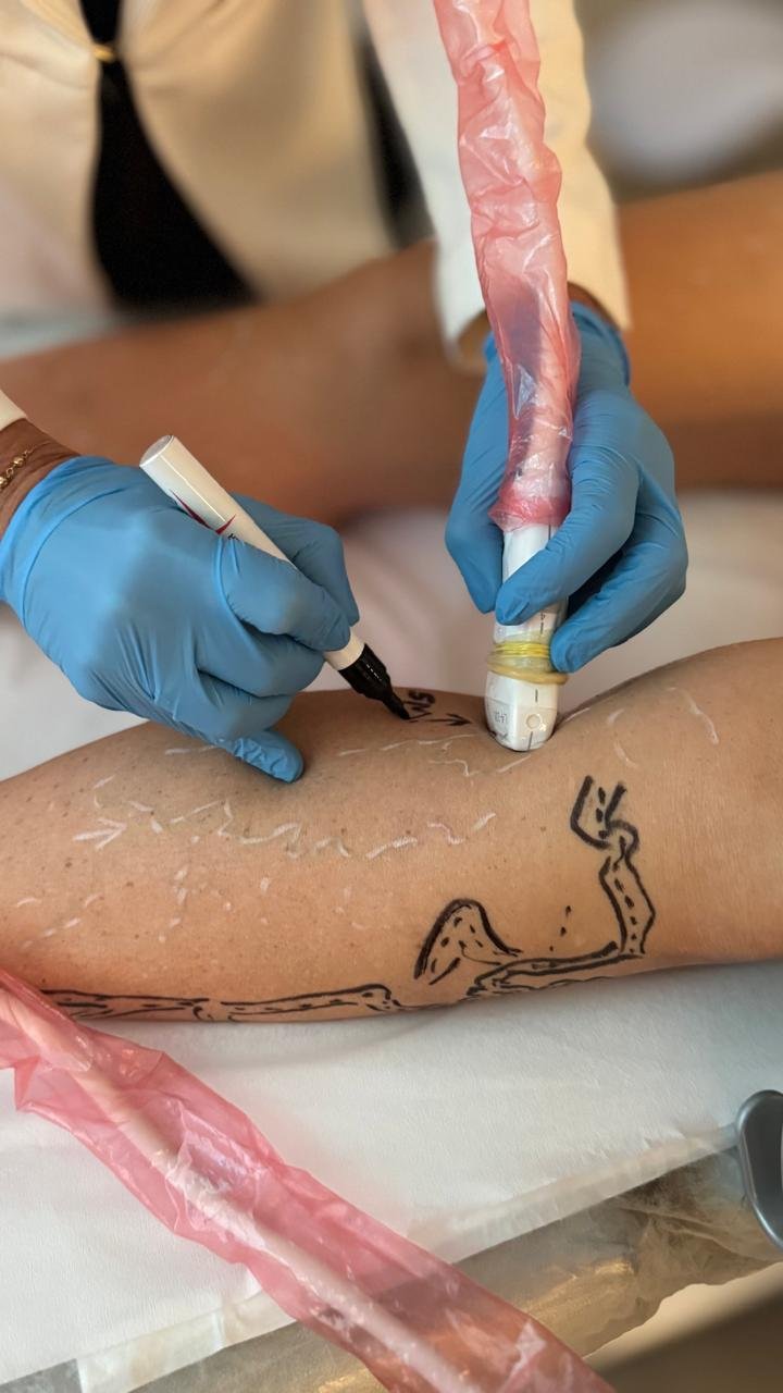 Começa com uma avaliação vascular minuciosa, incluindo mapeamento venoso detalhado por realidade aumentada e ultrassonografia vascular com eco-Doppler