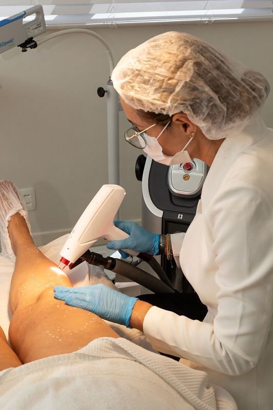 O tratamento das veias safenas, de varizes calibrosas e de veias perfurantes doentes é realizado com ablação a laser endovenosa (endolaser), que consiste em introduzir uma fibra de laser dentro da veia, guiada por ultrassom, para fechar o vaso doente e redirecionar o fluxo sanguíneo para veias saudáveis.